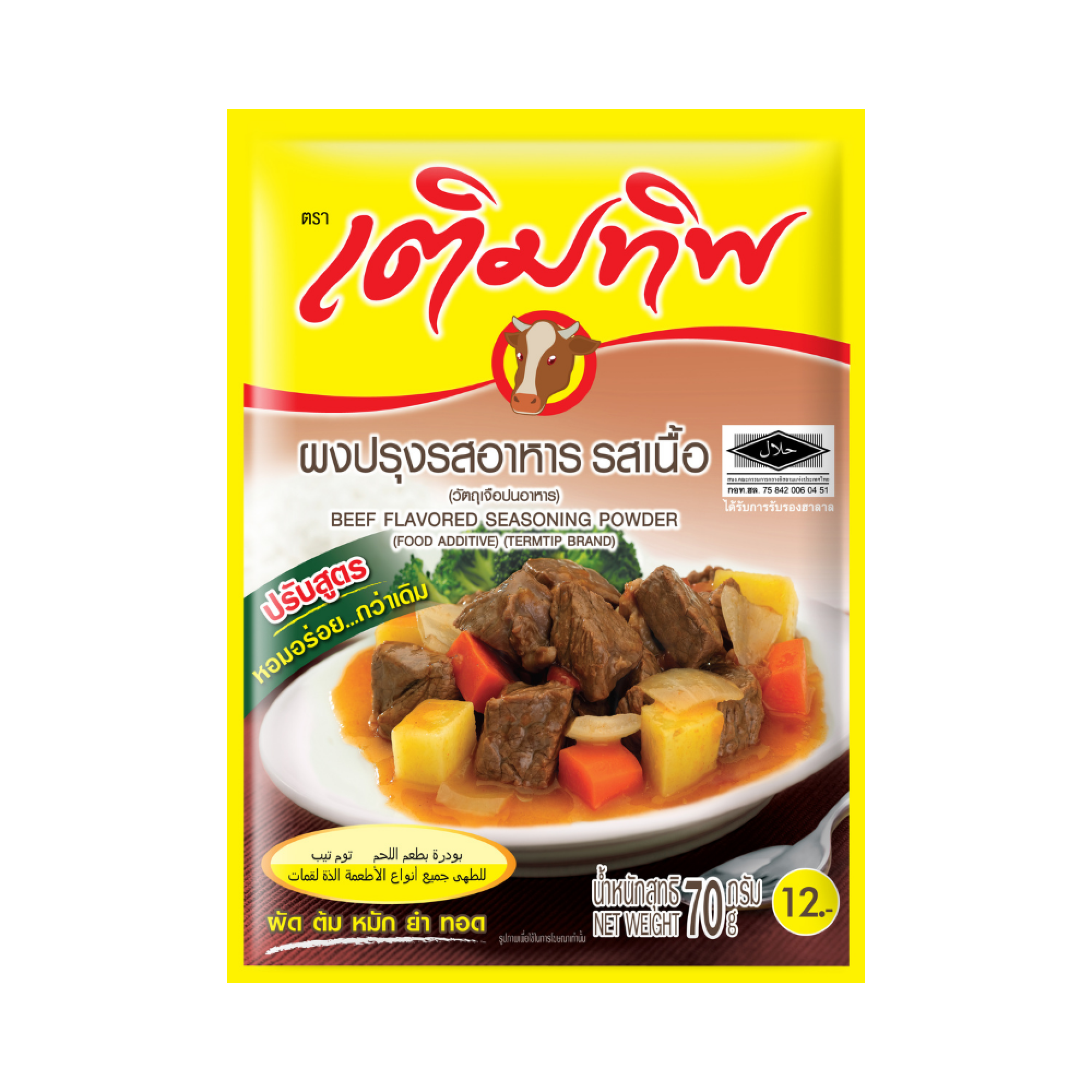 Description : ผงปรุงรสเติมทิพ รสเนื้อ ช่วยให้อาหารอร่อยกลมกล่อม ทำได้หลากหลายเมนู ทั้งผัด ต้ม หมัก ยำ ทอด หอมอร่อยจากเนื้อคุณภาพ ได้รับรองมาตรฐานตราฮาลาล สำหรับผู้บริโภคชาวมุสลิมโดยเฉพาะ